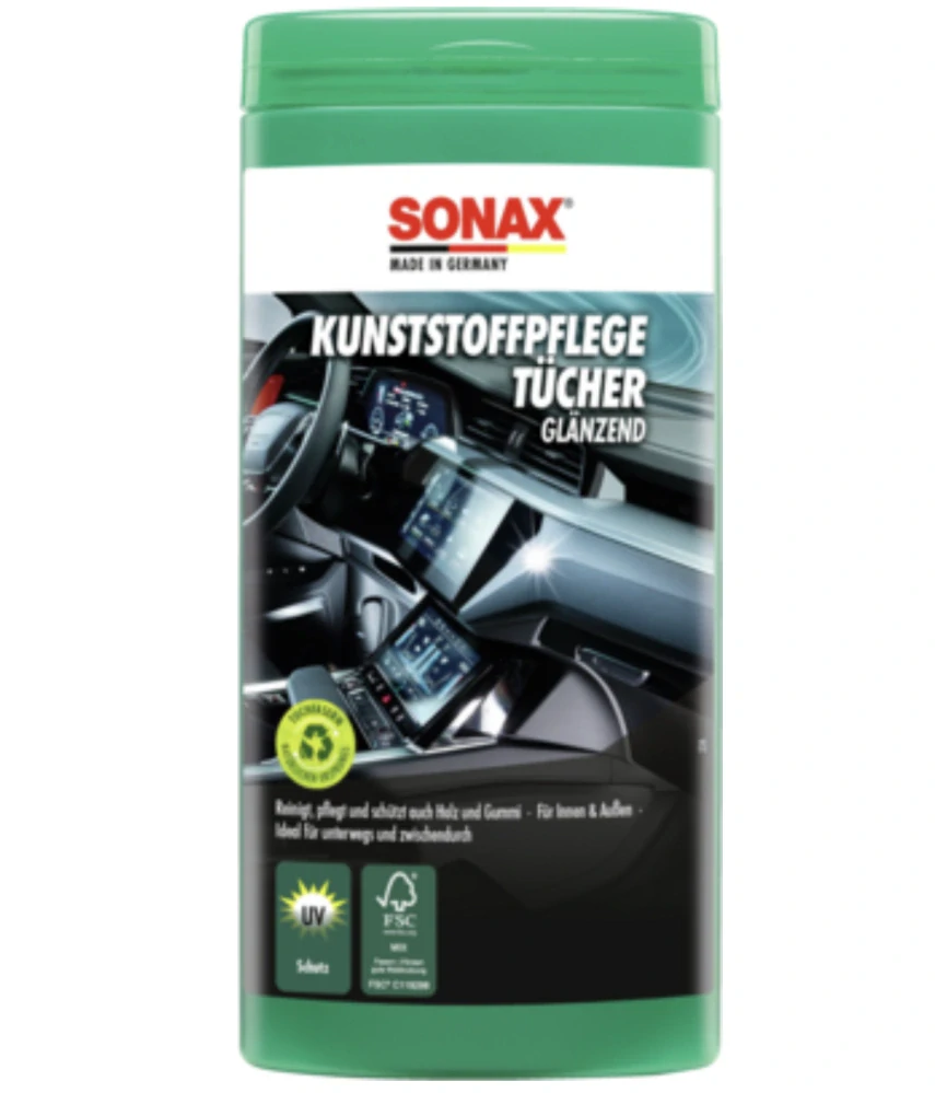 Prostředek pro péči o plasty SONAX Cockpit care wipes matt effect green lemon, je vysoce kvalitní čistící ubrousek určený pro údržbu a ochranu plastových povrchů interiéru vozidla s matným efektem. Tento produkt je dodáván v praktickém plastovém boxu obsahujícím 25 ubrousků, které jsou nasyceny speciální tekutinou s vůní zeleného citronu.